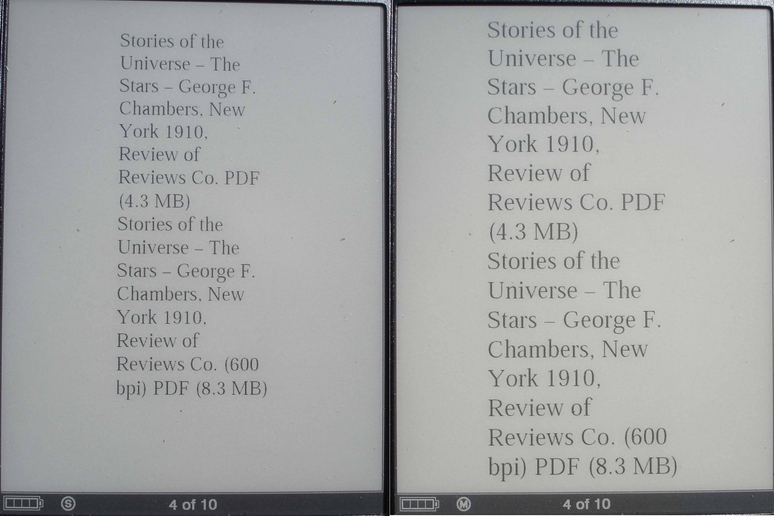 PRS-500 - It was taken in bright sunlight outdoors - The page is one scanned from an old book - 300 bpi - similar if not the same on both machines - about half a meg. |