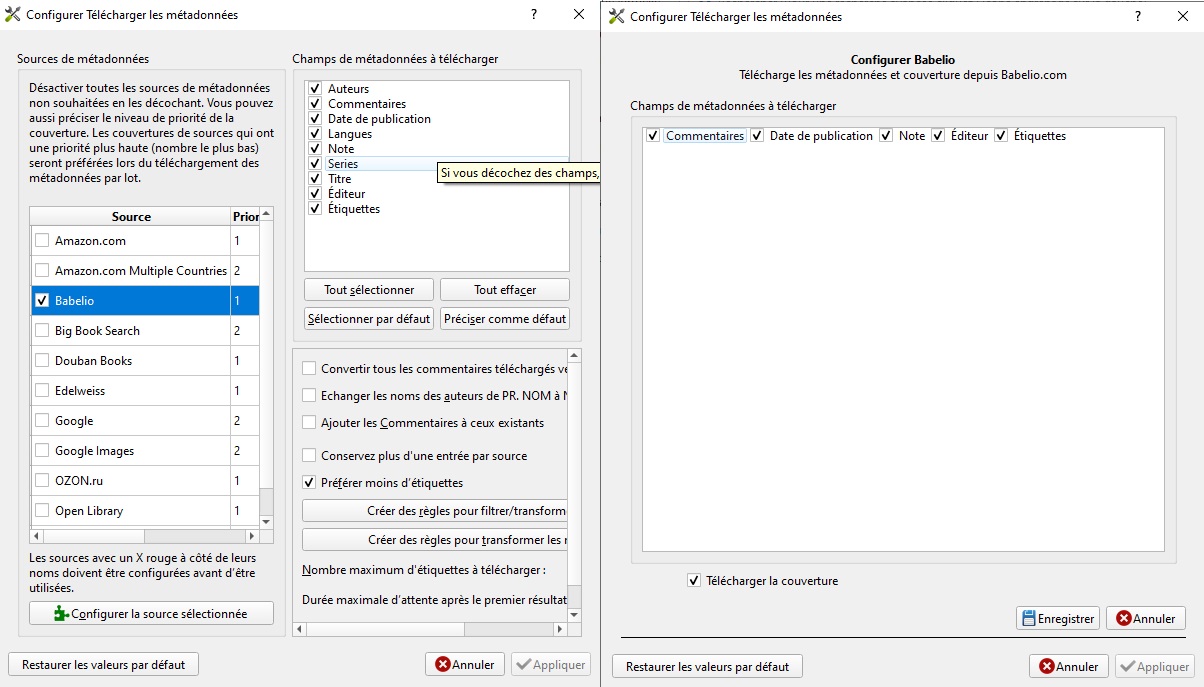 J'ai également cherché à avoir une bibliothèque Calibre la mieux organisée possible. Après de nombreux tâtonnements, voici ce que je suggère pour remplir les métadonnées manquantes. Les sites proposés par défaut pour télécharger les métadonnées sont tous anglophones. A ma connaissance, 2 extensions permmettent cependant de télécharger des métadonnées depuis des sites francophones : Amazon.fr et Babelio. J'explique comment installer l'extension Amazon.com Multiple Countries dans ce post https://www.mobileread.com/forums/sh...d.php?t=316539 message du 04-16-2019, 07:24 AM. Pour Babelio voir le post https://www.mobileread.com/forums/sh...d.php?t=294421 message du 09-16-2019, 11:06 AM. Le site Amazon.fr ne propose que des livres à vendre, Babelio (site communautaire de lecteurs) est plus complet. Concrètement : 1 - Après installation des extensions, ne cocher que Babelio et Amazon.com Multiple Countries (voire Google Images pour modifier ensuite la couverture si souhaité) dans 'Configurer le téléchargement' 2 - Pour chacune de ces sources ne cocher que les métadonnées à télécharger dans 'Configurer la source sélectionnée'. Cela permet de ne pas écraser les métadonnées déjà correctement renseignées dans Calibre. Bien que cochée, si le téléchargement ne récupère rien pour une métadonnée, la valeur déjà présente n'est pas effacée. Quelques remarques : - Amazon.com Multiple Countries permet théoriquement de récupérer des informations sur les séries, ce que ne fait pas Babelio. Je n'ai pas testé cette option car pour ma part je préfère renseigner manuellement cete donnée à partir de la fiche Wikipedia de l'auteur. Pour créer un lien vers Wikipedia (et Babelio) apparaissant dans le panneau latéral droit, voir mon message déjà cité du 09-16-2019, 11:06 AM. - Je renseigne également manuellement, le champ 'Eiquettes', Babelio proposant à mon goût beaucoup trop d'étiquettes (tags). Dans 'Configurer le téléchargement' il est possible cependant de limiter le nombre d'étiquettes téléchargées, voire d'appliquer des règles pour ne récupérer que certains tags. Je n'ai pas testé ces options. - Concernant le résumé du livre (commentaires), la règle qu'applique Calibre pour renseigner cette donnée n'est pas évidente lorsque plusieurs sources sont sélectionnées. Je conseille de ne choisir qu'une seule source (Babelio par exemple dans 'Configurer la source sélectionnée'. Pour harmoniser la police de caractères du résumé, installer l'extension 'Cleaning Comments'. - J'utilise la colonne Note pour évaluer moi-même mes lectures. Je ne télécharge donc pas cette donnée par l'extension Babelio (ou Amazon) ne la trouvant pas significative. En revanche, j'ai développé une petite extension pour récupérer la note moyenne attribuée ainsi que le nombre de votants sur le site Babelio. Pour installation voir mon post https://www.mobileread.com/forums/sh...d.php?t=294421 - Ajouter une colonne signalant que toutes les métadonnées d'un livre sont correctes peut être utile, lorque la taille de la bibliothèque est conséquente. - Avant de modifier les métadonnées, il me semble préférable d'examiner les données téléchargées pour affiner la configuration. J'espère avoir répondu aux questions posées Christophe |