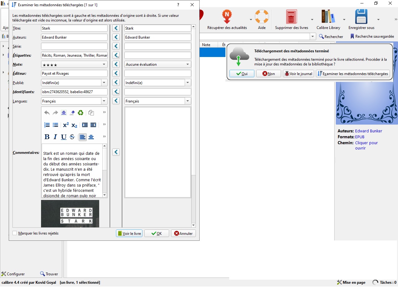 J'ai importé ma bibliothèque en structurant les noms de fichier pour identifier les données comme suit: "auteur - année - [série - Tome] - Titre.epub" Ces métadonnées-là sont donc correctement rapatriées Je voudrais maintenant intégrer d'autres métadonnées: note, étiquette, éditeur (éventuellement) et résumé Bon nombre de ces informations sont dans les métadonnées des epub qui ont déjà été importés Question 1: est-il possible de les faire arriver dans Calibre sans réimporter le tout? Question 2: en anticipant le fait que ce n'est pas forcément possible, quelles sources de métadonnées me conseillez-vous pour rapatrier un max d'informations? Actuellement, j'utilise Amazon, Big Book, Edelweiss, Goodreads, Google, Google Images, Ozon.ru, Open Library & Overdrive Malgré cette liste de sources, j'ai encore bon nombre de livres pour lesquels je ne trouve pas les métadonnées Merci!! |