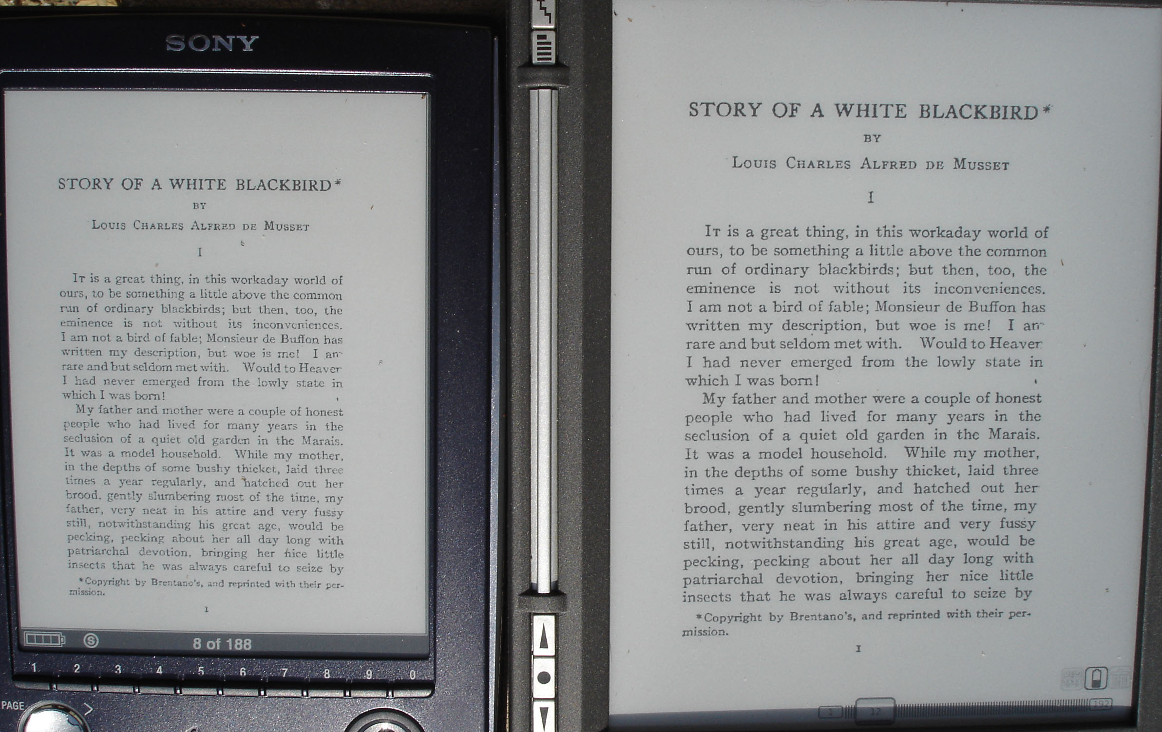 PRS-500 - It was taken in bright sunlight outdoors - The page is one scanned from an old book - 300 bpi - similar if not the same on both machines - about half a meg. |