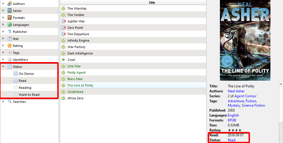 I can perform searches and run saved searches, but would be nice to also have it just available directly on the sidebar to quickly filter out my library to all "read" books or "not read" books, etc.