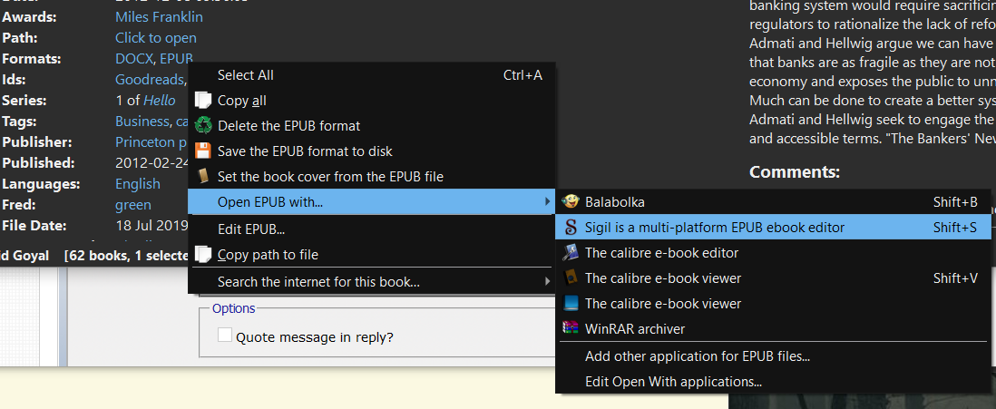 And this may save you a bit of time: I press Shift+S to open an EPUB in Sigil, no plugins, no closing explorer windows. You can also get at calibre's Open With via the View Specific Format option, but a shortcut is easier. I had Edge as an EPUB Open With option, until MS . . . BR |