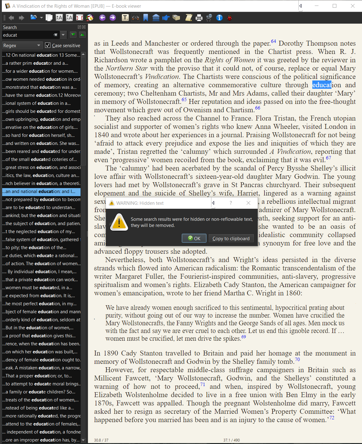 I tried merging the xhtml files into one as I thought it might have something to do with the issue, but I still get the messages. What I don't understand is that the 'correct' snippets are shown in the sidebar - i.e. they match what I see in Word using the same searches on the DOCX source docs. It's when I start selecting them that I get the message. Which leads me to ask, if there are instances of the search in hidden or non-replowable text why are they even in the side bar? BTW In the context of an ePub book, I don't know how to hide or create non-reflowable text. This may be relevant: when I click on a snippet in the search sidebar, the Copy to clipboard button in the toolbar flashes. This happens whilst the viewer is getting to that location, or removing items from the search snippets list etc, this can take a second or two. Does the viewer make any 'internal' use of the clipboard - as far as I can tell it does not, so why is that button flashing one asks? A search seems to populate an entire list of snippets considerably faster than it sometimes takes to display the page on which a selected snippet appears. If I select another search list snippet after some have been removed, it seems to reinstate some and remove other snippets, and the text in the viewer windows is very often positioned to the very last occurrence of the search term - which was not the item I selected MID FLIGHT UPDATE - It may have something to do with the size of the list and/or the 'speed' of navigating through it. Sometimes I can hold down F3 and traverse the entire list of ambassador's in War and Peace. Other times I can't click on two or three randomly with getting the WARNING and a depleted list. Searches with lots of snippets seem to suffer the problem more than searches with just a few snippets. NB: the War and Peace example is an epub I got from here, I wanted to be reasonably sure that my DOCX's and conversion were not causing the problem. BR Last edited by BetterRed; 02-22-2020 at 11:07 PM. |