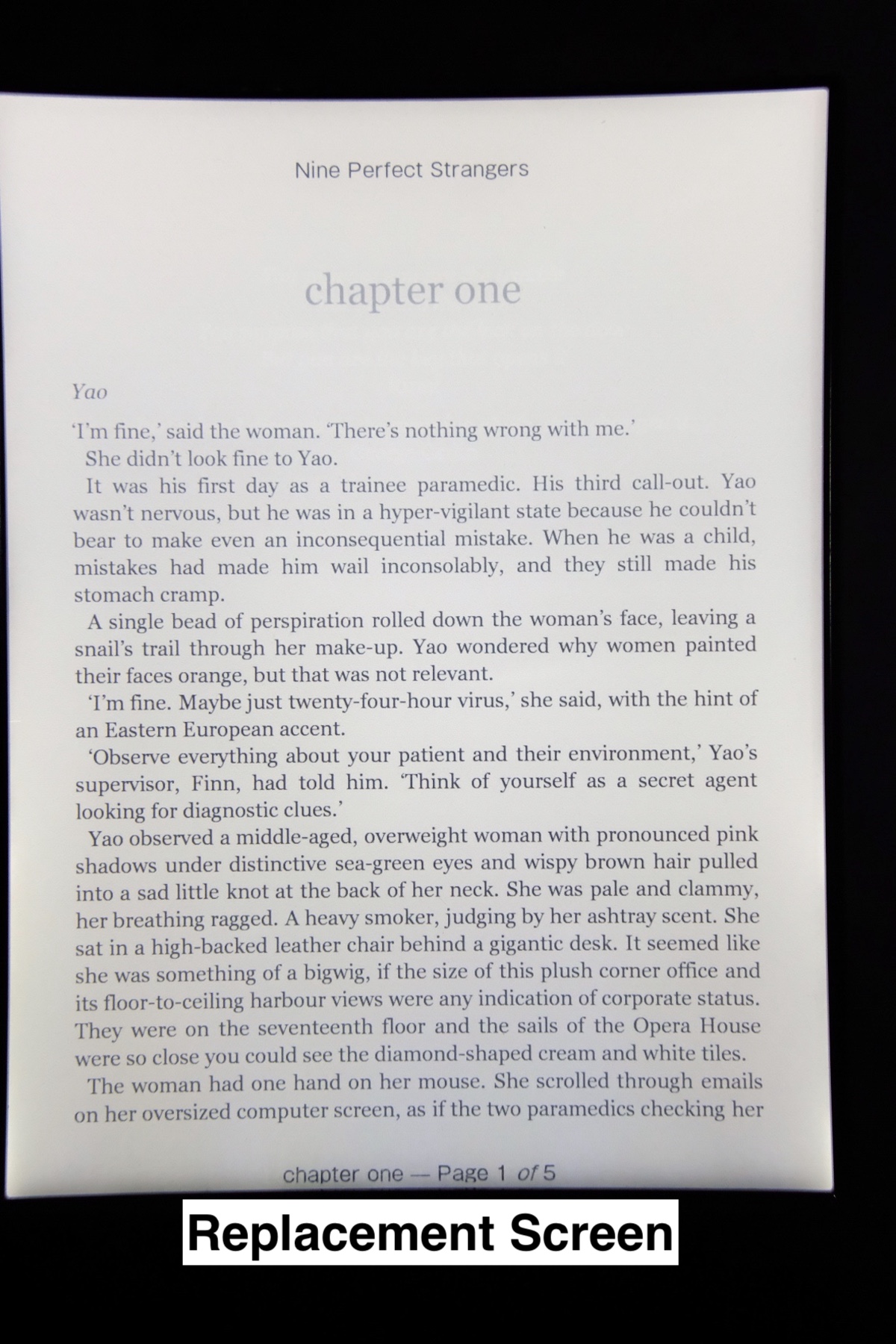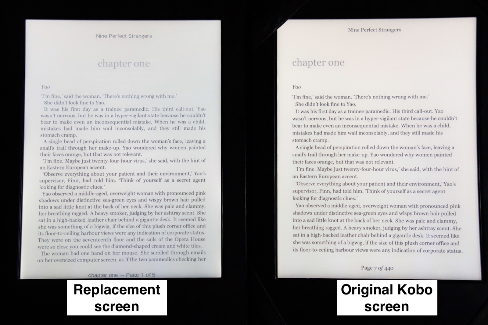 The replacement screen looks a little washed out to me, even more so when compared to the original Kobo screen. I'm not sure if all replacement screens sold by the seller I got it from are like this or if I just got a dud. It appears especially washed out at the top, a little darker in the middle, and again lighter at the bottom (although not as light as the top). I also get the "water on your screen?" message a lot although ReaLx3m has very helpfully pointed out that this can be disabled in settings. Touch screen functionality is a little spotty in the H2O with the replacement screen, maybe because of the double-sided tape I've added onto the existing adhesive (which already wasn't very sticky due to 4 years of accumulating dust). A newly opened H2O may fare better. Update: I just realized my bezel lifting up may also be part of the reason for the unreliability of the touch screen. Something about the bezel not lying flat may be interfering with the infrared beams. I find that the touch screen functionality behaves better when I try to press down gently on the the bezel to get it to lie flat. A bit of a hassle but I'll live with it until I figure out a way to get the bezel to stick properly. One more problem I've noticed is that I can connect to wifi but none of my Pocket articles are updating. I'm still on software 3.11.0 (10/16/14). Maybe I need to update the firmware manually to get Pocket to sync again? Another problem for another day. Anyway, I made this post because of how nice and helpful everyone has been in this forum, especially ReaLx3m and frostschutz and hope to pay it forward. Hope this might be useful to others hoping to revive their H2O's
