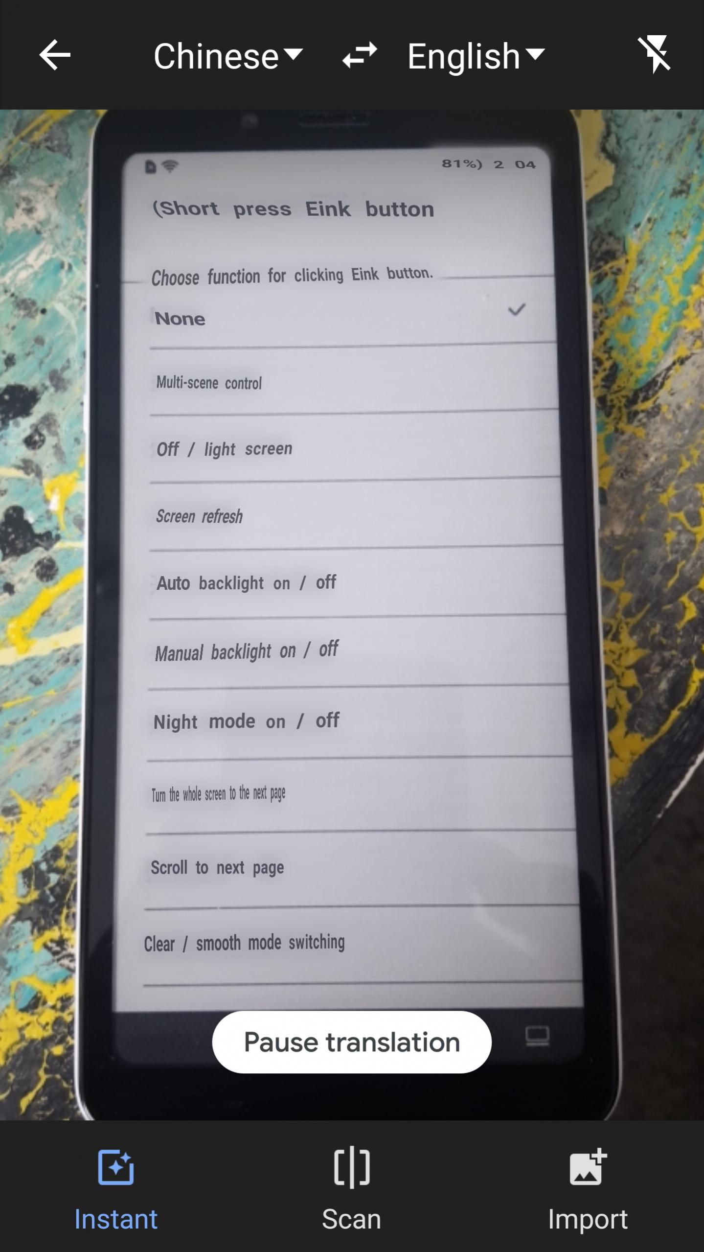 For reference, this is Google translating all the options for 'short press E ink button'.