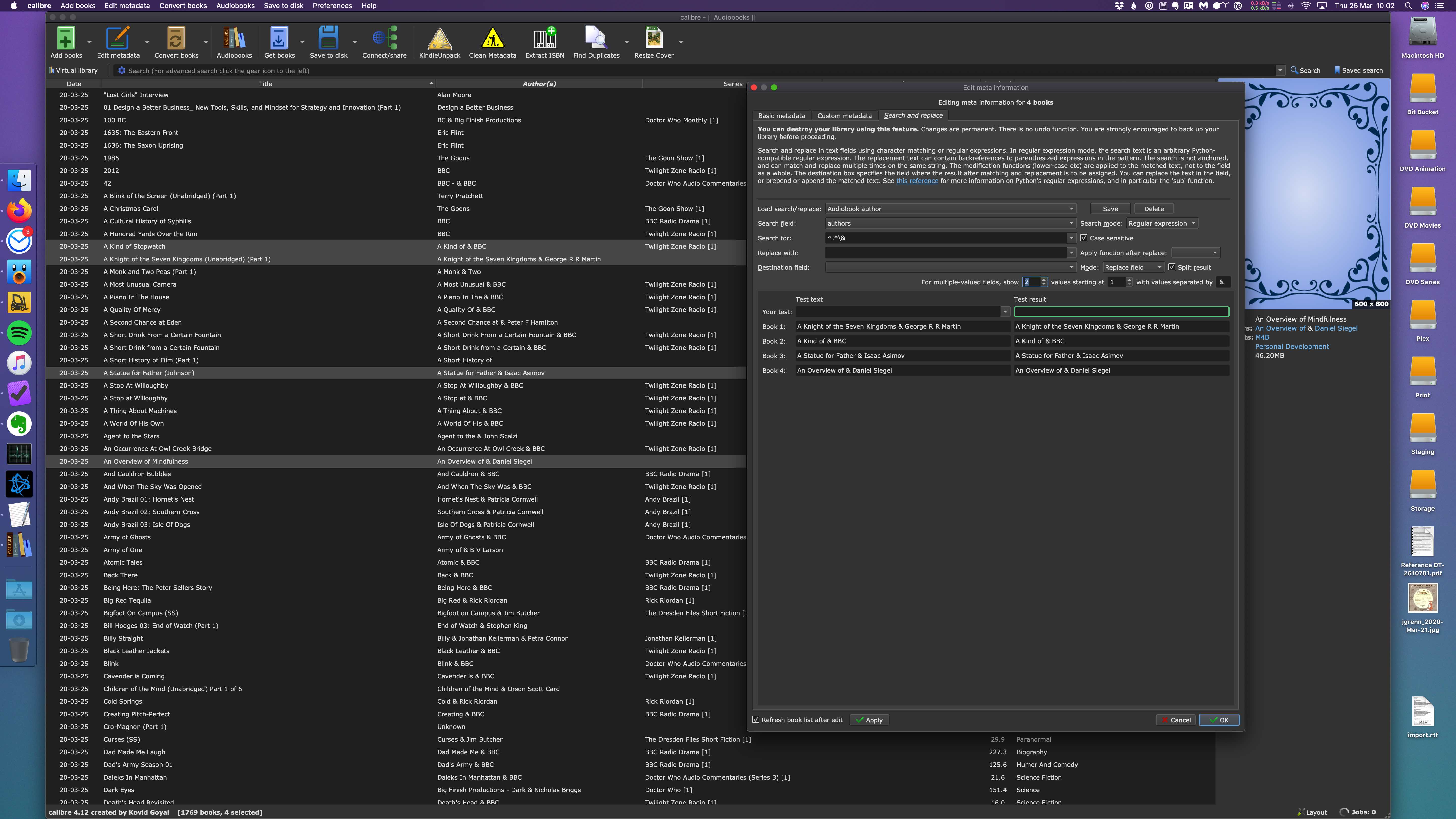 I have a situation where a metadata reader has added half of the title and the author as two separate authors in the 'authors' field. In all cases, the incorrect data is the first entry in the multi value field. Normally I'd just fix it by hand, but there's 2000 of them, and I suspect it's going to happen again (it has already) so I'd like to find an automated fix. In the bulk metadata Search & Replace, I can isolate either the first value or all of the subsequent values (usually only one) using the "For multivalue fields, show <x> values starting at <y> with values separated by <xxx>" but I can't get the Replace part to work - it simply leaves it as is. It displys it correctly in the GUI, but doesn't seem to write anything. Strangely, I can get it to work with the 'authors_sort' field (using the regex "^.*\& " and the multi value settings as above), but can't find a way to bulk set the 'authors' field from the 'author_sort' field. If anyone has an answer to either issue (preferably the first, but I'm not going to be picky :-D ) I'd be really grateful. Thank you! Stephen Last edited by sasilk; 03-25-2020 at 05:57 PM. |