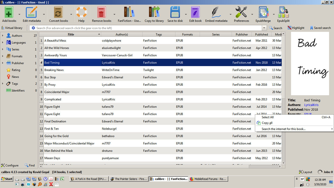 That IS where I'm right-clicking! Since I pare down information I don't really need the only things that show under the cover image are Title, Authors, Published, and Formats. So if I right-click on that epub after Formats: all I get is Select All, Copy all, and Search the internet for this book as shown in the screen shot I posted.