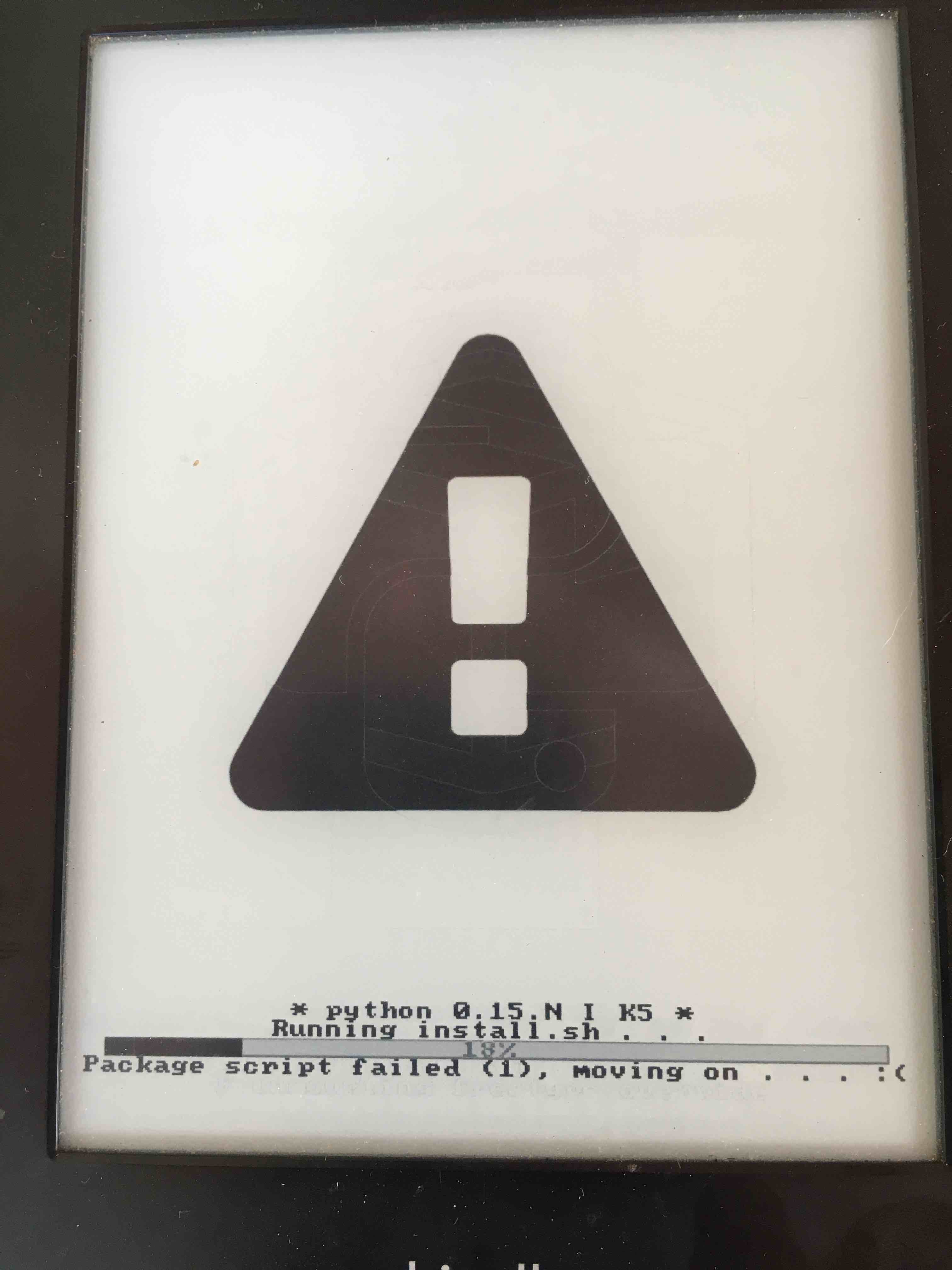 I'm not sure I have any space constraints (I have 300M+ free), but I've tried to install python (Update_python_0.15.N_install_touch_pw.bin) on my Jailbroken PW1 running 5.4.4.2 with the same "Package script failed (1), moving on... " error (See attached image). I assume the Font Overrides menu isn't populating the list because of a faulty/incomplete Python install?What should I be trying? Thanks for your time. ![]() Quote:
