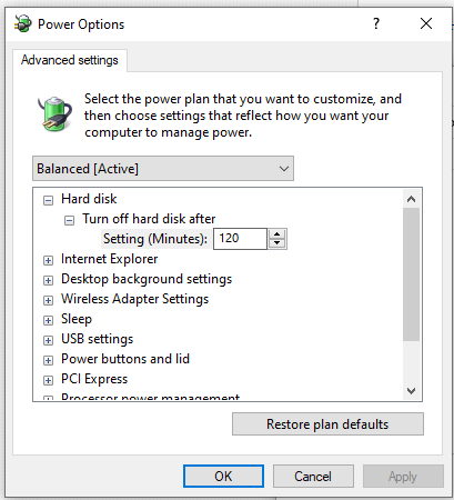 1. control panel power options advanced... change when hard drive sleeps. I would set that to never and then control with method 2, below 2. each major USB drive manufacturer usually bundles some free utilities, one of those will give you access to when /if the drive powers won if idle. ( another, for my WD passport drives, controls when the light glows ) if you don't have that, google the drive manufacturer web site and see if you can find one. Or google search on something like [name and make of drive ] usb drive sleep options. I have never hears of a USB drive that shuts down after only a minute though; I wanted the drives I use for plex media server to go dark/quiet as soon as there was nothing streaming. but the shortest setting I could get with both toshiba and WD was 10 minutes if #2 is no good, then maybe set a value with method 1, but I think that windows applies the same setting to all drives. Before I switched to SSD, I wanted my C drive to be always on, otherwise there is a noticable delay when a spinning drive has to spin up + I read that parking/sleeping the drive many times a day is more wear and tear than using always on. PS also in power options, there's a setting for whether windows can suspend USB ports that are idle. dunno if that affects drives, but turn that off also, for good measure if you like |