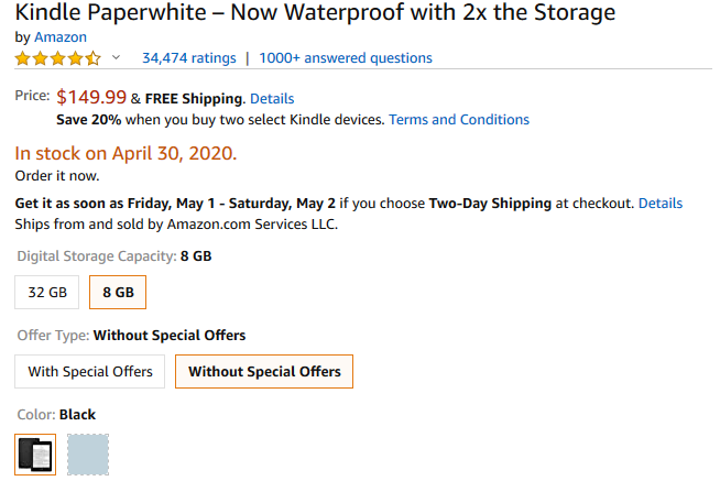 Kindle Paperwhite: 129.99 at Amazon (with ads)