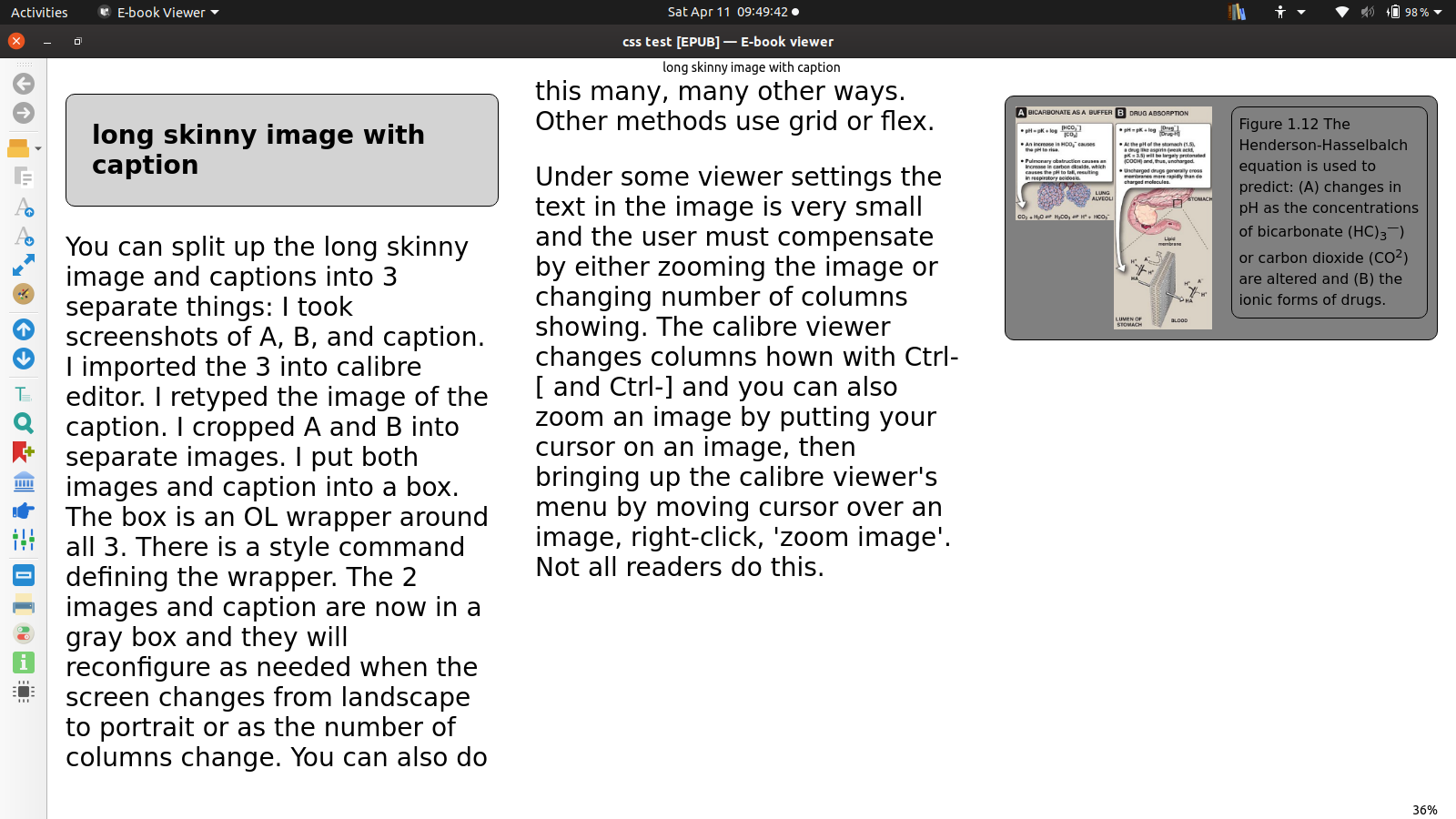 Sorry, I thought you were looking for advice on how to EDIT the book so that long skinny images would stay with caption. If you are just looking for a way to view the book better without editing it, I suggest using the multicolumn Ctrl-[ and Ctrl-] feature of the calibre reader. Images will be followed by caption in next column automatically in a correct alignment. You can zoom the image in calibre's viewer. Best regards, Pop |