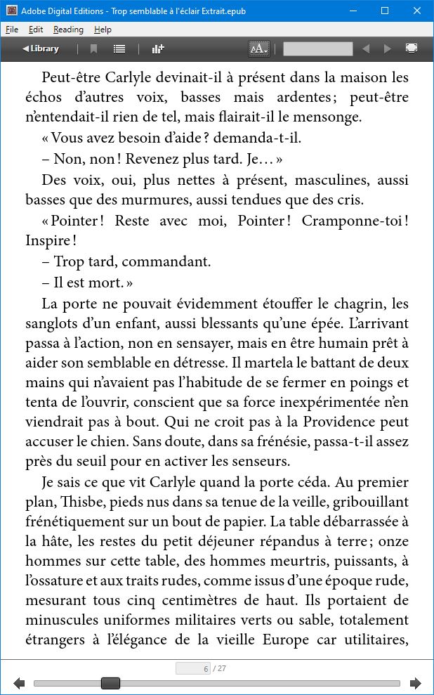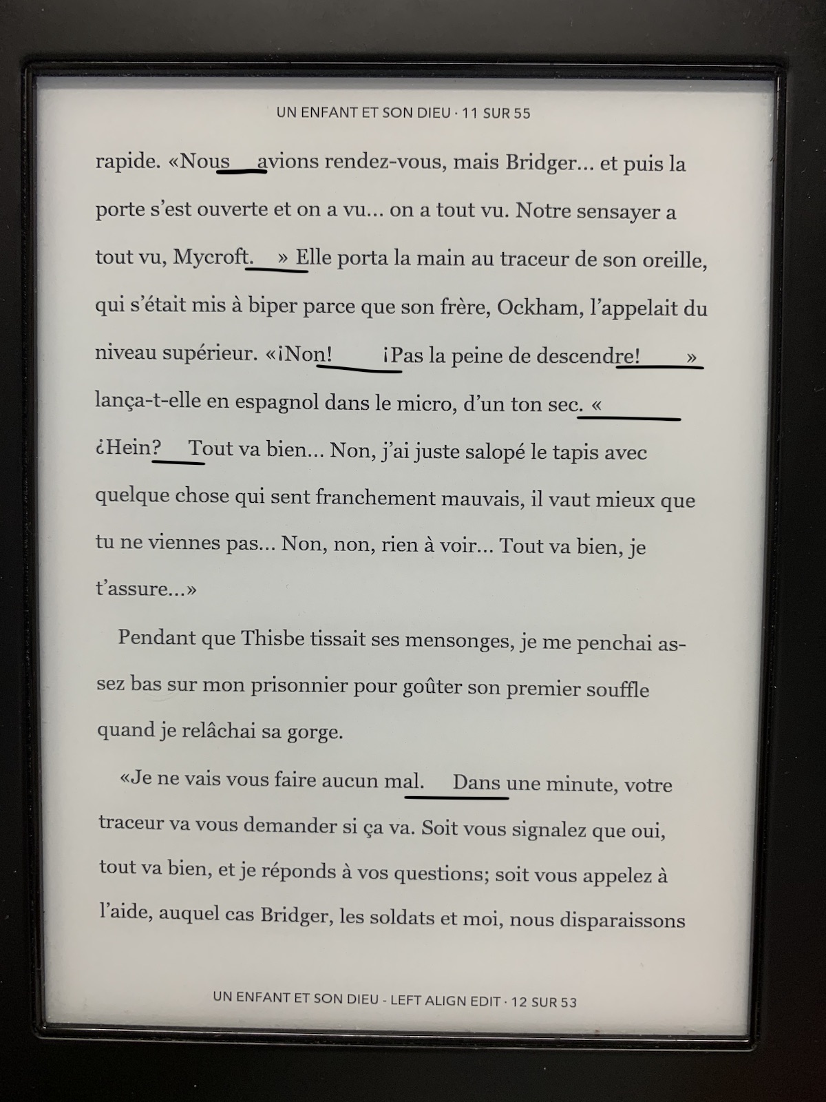 <p>– Ah oui, je… » Les paroles prononcées de l’autre côté de la porte parvenaient au visiteur mutilées, à demi étouffées. « J’ai appelé pour annuler. Nous avons une… un… problème… ennui… de sécurité.</p> I know that there are issues in the kepub parser for some characters. For example, spacing is added around an emdash when it probably shouldn't be. And isn't in an epub rendered using the RMSDK. I think there are similar issues with other characters such as the thin space used used. But, I don't normally see these as they are uncommon in English text. From what I can see, the extra long spacing is where there is a line-break and then leading spaces within the paragraphs and a thin space or endash on the previous line. This appears to be a bug in the parser. It might be language specific handling that is wrong. But, removing the line breaks and the leading spaces in the text improves the rendering a lot. Note: When doing this, I didn't do anything to add the spans into the file. I took the supplied sample and added it directly to the device. And edited another copy to wrap the text within paragraphs. Adding the spans would make a difference to this. It might be a case were wrapping the paragraph rather than a sentence within works better. Looking at a sample from Kobo to see what they do might be a good idea. |