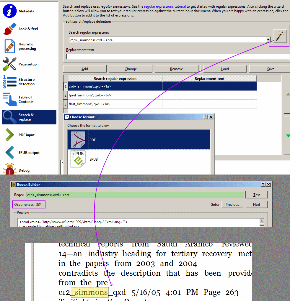 https://sigil-ebook.com/get/ → https://github.com/Sigil-Ebook/Sigil/releases Another couple of questions while I experiment: 1. In the Search & replace, although the regexes work fine when testing with the wizard, the strings still end up in the EPUB. Any idea why? 2. Is there a way to tell Calibre to ignore such and such pages in the input file, such as those that contain the ToC or tables, since I know they'll turn into garbage anyway? I might try and replace the tables later in the EPUB as PNG instead. |