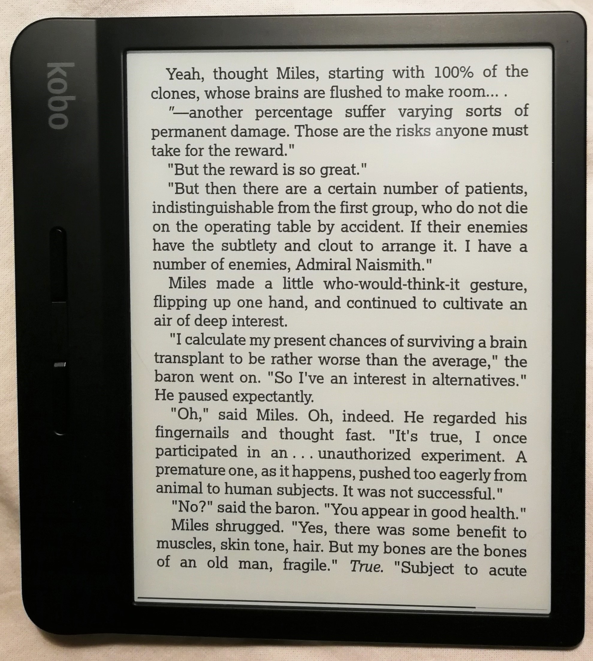 I use LexiaDama. My Kobo is patched, including custom font sizes patch, so the size seen on the photos is not one of the defaults. I always have the frontlight on. The warm light is on in an artificially lit environment, but off in the daylight. |
