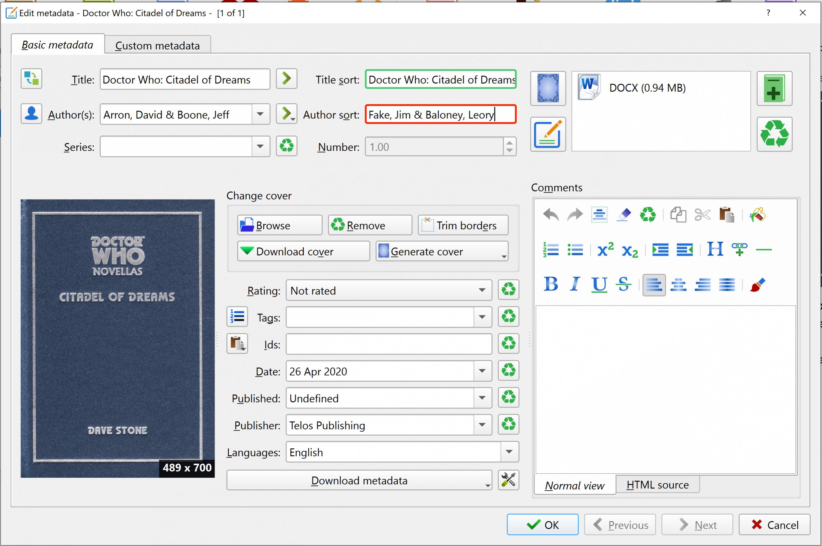 Notice that the folder names are based on the fake names in the "Author sort" field, rather than the real names in the "Author(s)" field.