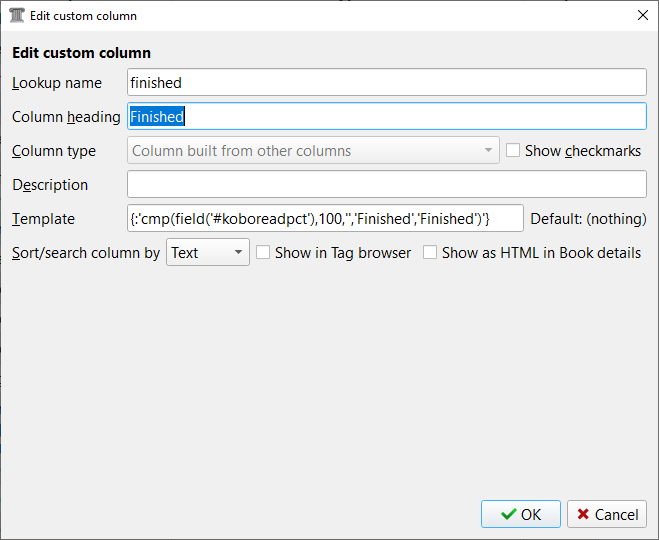 I have been searching for a solution to a question I have: Namely, is there a way to create controls for a custom column that will set each book's status as: Completed {Status = 100% completed}; Started {0% < Status < 100%}; New {Status = 0%}? So, depending upon the status of each book, enter either 'Completed' or 'Started' or 'New'. Further, is it possible to fill this column while the e-book is connected and then retain the values after it is unplugged? Another custom column I would like to see is an automatic setting of a column like 'On Clara' if the book was in my ebook reader the last time it was connected and retain that value after unplugging? Any suggestions would be most appreciated. Sparky |