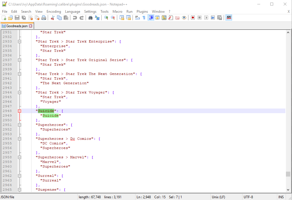 I believe my problem may be that the more specific shelves like 'suicide' are user created and not a gr shelf and that this is why the plugin isn't receiving them.