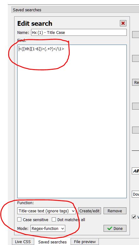 Automatically fixing the case of headings in the document Here, we will leverage one of the builtin functions in the editor to automatically change the case of all text inside heading tags to title case: Find expression: <([Hh][1-6])[^>]*>.+?</\1> For the function, simply choose the Title-case text (ignore tags) builtin function. The will change titles that look like: <h1>some TITLE</h1> to <h1>Some Title</h1>. It will work even if there are other HTML tags inside the heading tags. |