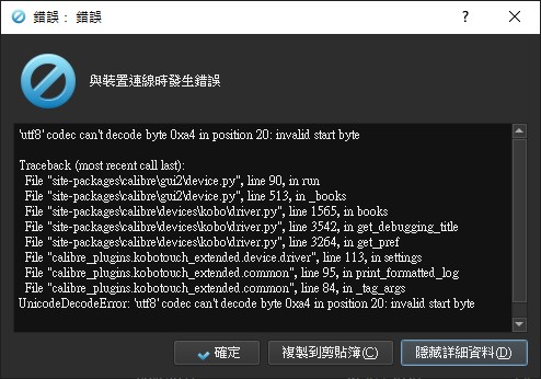 錯誤: 錯誤: 與裝置連線時發生錯誤 'utf8' codec can't decode byte 0xa4 in position 20: invalid start byte Traceback (most recent call last): File "site-packages\calibre\gui2\device.py", line 90, in run File "site-packages\calibre\gui2\device.py", line 513, in _books File "site-packages\calibre\devices\kobo\driver.py", line 1565, in books File "site-packages\calibre\devices\kobo\driver.py", line 3542, in get_debugging_title File "site-packages\calibre\devices\kobo\driver.py", line 3264, in get_pref File "calibre_plugins.kobotouch_extended.device.driver" , line 113, in settings File "calibre_plugins.kobotouch_extended.common", line 95, in print_formatted_log File "calibre_plugins.kobotouch_extended.common", line 84, in _tag_args UnicodeDecodeError: 'utf8' codec can't decode byte 0xa4 in position 20: invalid start byte thanks a lot but the problem still there. |