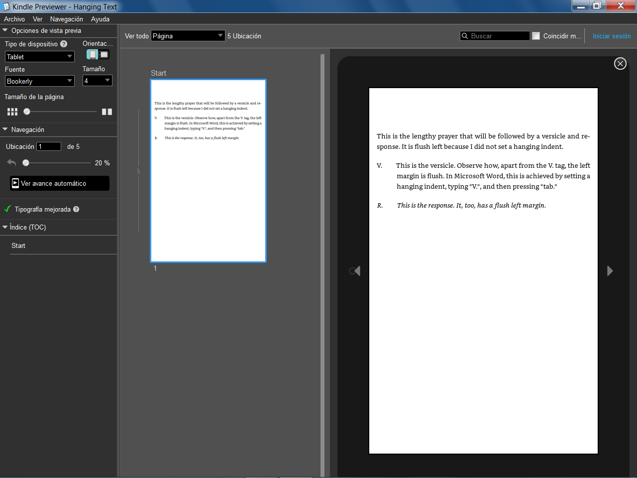 The only way I've found to use what are effectively custom list tags (the v and the r, with "." each), and have left-aligned hanging content to a box of text that is then indented, is with tables. No, that won't work on a Kindle 1, the first-ever released Kindle, but it will work on everything else. HTML doesn't take kindly to custom list identifiers (e.g., A) instead of 1.) and we all know that tabs don't work at all. If you use required spaces, then the space in the first line will always get distorted, by the justification algorithms (but, btw, that's what we do and that's what we tell the clients, unless they want to pay us for table-making). If it has to be perfect; if you don't care about the money paid to a formatter or are DIYing, two-cell tables are the only answer I've ever found that works on EVERYTHING. The only reason that works in Word, at all (unlike Wordperfect, fwiw) is because you're effectively outdenting the list tag (v/r), then tabbing over to the actual margin. There isn't, afaik, any viable way to do this in the HTML and CSS that drives eBooks. (As you see, if you try a negative indent for the first line you'll have slightly misaligned first letters on the first line after the faux tab.) Sorry. Hitch |