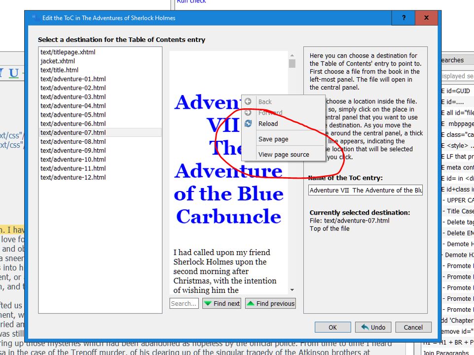 Agree that it should not ignore words in quotes (wasn't exactly what I meant) However, it works differently if Smarten Punctuation has been run, since while it handles a leading ASCII 34 correctly, leading curly quotes have a different result (Before-Quotes.jpg and After-Quotes.jpg) https://manual.calibre-ebook.com/edit.html#id18 2. When I do the above from the User Manual to get the green line and right click (TOC.jpg) I get options to [Reload], [Save Page], and [View Page Source], but I can't get anything to happen when I click them. I was expecting that [View Page Source] would open the edit window to that point 3. TOC View (TOC View.jpg) does link to the edit window which conveniently allows me to fix/change the TOC source, but it's not clear what [Refresh] does. [Edit] does open the TOC editor and I can rebuild/refresh using that |