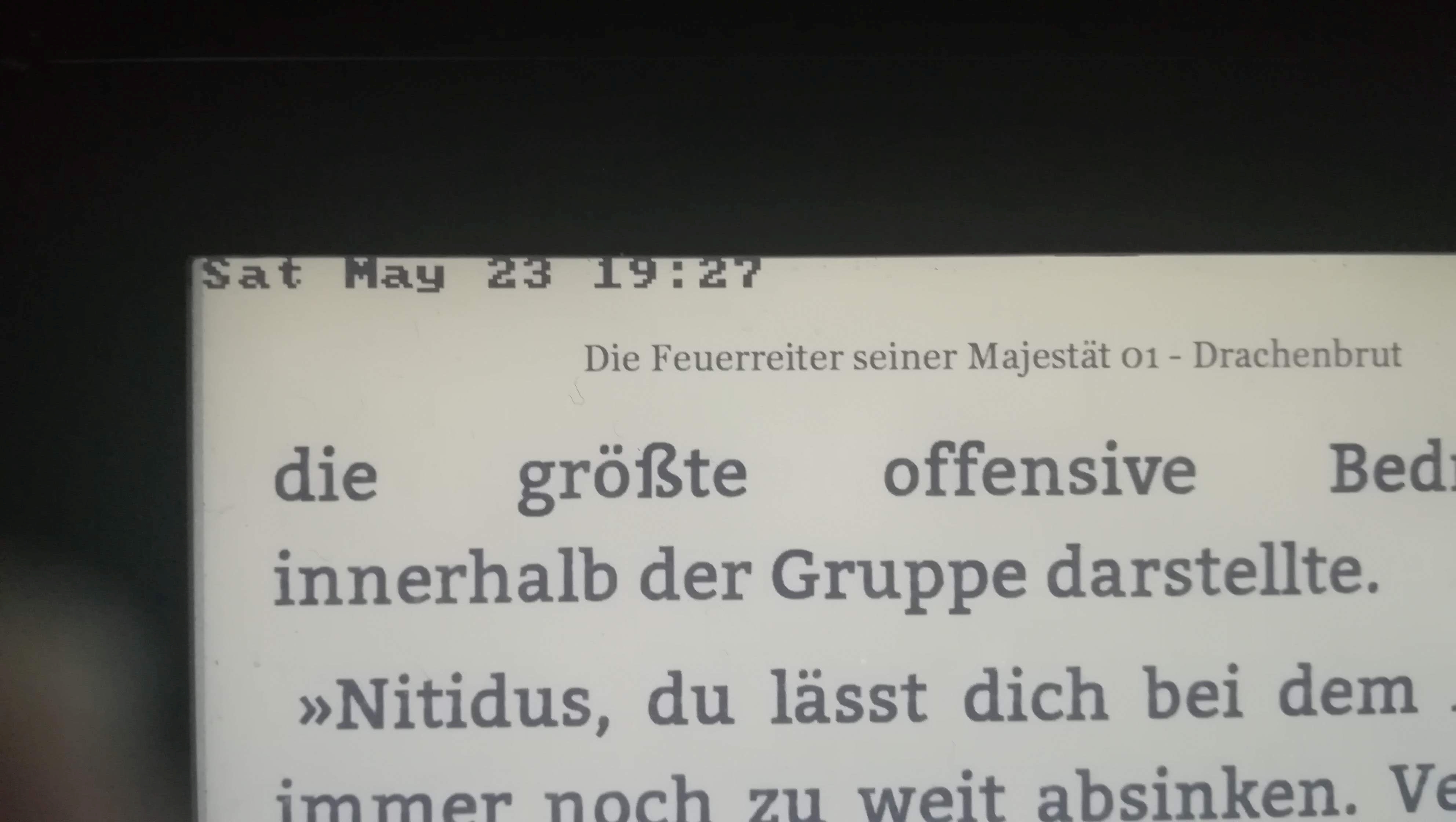 I only read Kepubs in German. Date and Time starts fine, and just stays that way. Time never changes - only when I touch the display in the upper section - to bring up the menu - then the time changes.