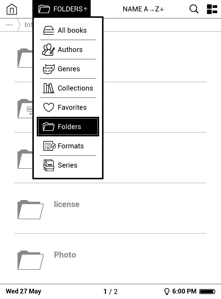 2) I'm nearly positive that the InkPad X does NOT come with a cover — unless they handle this differently in Italy. 3) The PB615 (and, I assume, all PocketBooks) default to putting books in folders by author. (See screen captures.) 4) Calibre works fine with my PocketBook, though I'm not doing anything special with it. Just moving books to the PB615. The PocketBook also likes my Constantia font. I've given a couple samples of what a 6" screen looks like (one with the status off – for full page – one with it on). I like the clean screen. EDIT: I've added a 5th screen capture to show what viewing choices PocketBook (at least version 5.17.xxx) gives you. Last edited by rcentros; 05-27-2020 at 08:57 PM. |