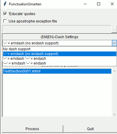I use this in Sigil to 'correct' files downloaded form ... everywhere. Recently, I noticed a perceived problem. The file in question had this, " -- " or {[space][hyphen][hyphen][space]} and changed it to "—" or (EM DASH}. The writer meant to have a space before and after the punctuation mark, why was it changed the way it was? The proper change, in my view, would be to " – " or {[space]EN DASH][space]} as this makes the epub a better read. Thank You |