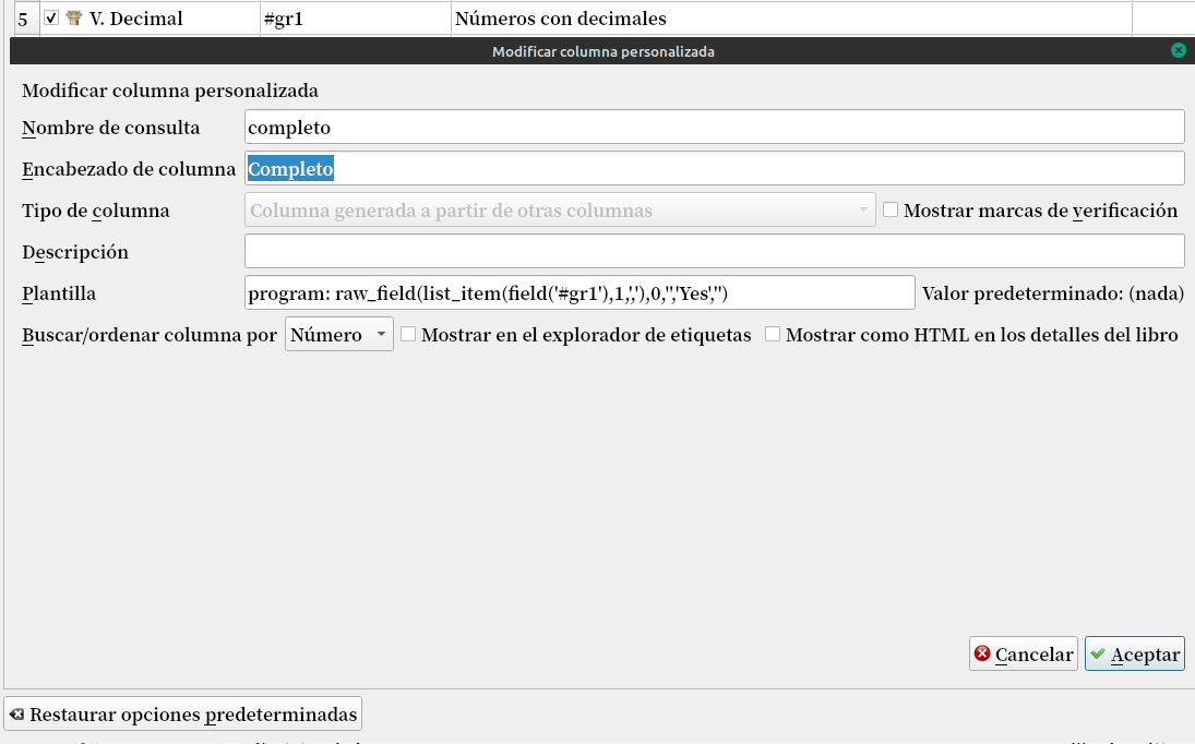 I would like to make a column that depends on it to tell me if all the data in the book is complete, if the decimal column has the column heading "V. Decimal" and the query name # gr1. What should the template be like? I tried with program: test (select (field ('V. Decimal'), '<> "0"'), 'Yes', '') |