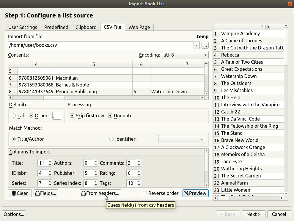 I have been testing out this plugin and it seems to work great. I noticed that lately it has been matching up with the title/authors better. It used to be really picky about matching. Now it seems almost as if it remembers previous matches and it is also really quick. I haven't had to go hunting for titles/authors nearly as much as I used to. One thing I did notice though is that when I am doing a big import (upwards of 500 lines) after a while, the plugin seems to get glitchy and when I choose a title that isn't matched up to find the match in Calibre, it won't show the title/author of the book I selected. I choses some random other book title/author. I'm not talking about the choices to match with, but the actual book in the list I choose to find a match. AN example would be that there isn't a match for The Chronicles of the Black Company by Glen Cook - selected to find match Lucky by Jackie Collins - the book in the search bar for matches. It usually fixes itself if I reselct the book, but it sometimes happens maybe 5 or more books in a row. Also, did you fix it so that it doesn't drop the leading "The, A, or Of"? I have my library sorted strictly alphabetic and that seemed to always snag the plugin. Finally, is there a way of possibly adding the ability to maybe sort the columns in the final view to my liking? I like to have some of the columns in the library side side by side with the columns in the list side, like dates. I like to be able to compare them side by side wihout having to stretch or move the columns which end up moving the scroll bar over and messing it up. Anyhow, that's all for now. Keep it up! |