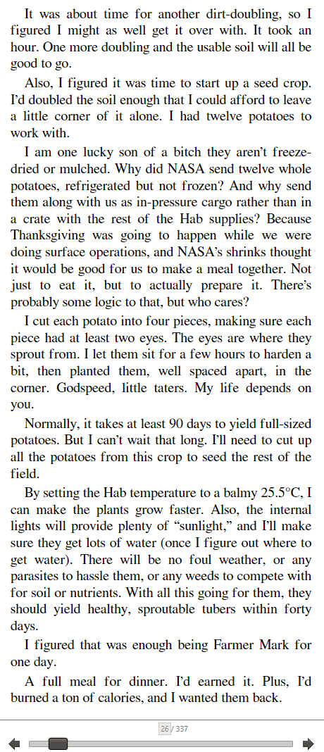 The simple gap+noindent also causes issues when the new scene starts at the very top of a page. You'll assume it's a continued/split paragraph from the previous screen. I think the one I read all those years ago was Andy Weir's The Martian. I just checked, and they mix Chapters > Daily Logs > gap+noindent / 3 centered bullets •••: Image 1 is the previous page. Image 2, you can see the gap+noindent landing on the very top of the screen. No reasonable person would notice this. You would continue reading, then wonder why there was just a drastic change in scene/tone, become confused, MAYBE click back... and/or just continue reading. Image 3 shows centered bullets in a later chapter. Overall, not the best ebook decisions, and probably just replicated the Print formatting... Nobody is reading the book at Image 1 and thinking: "Oh, that final word ends before hitting the right margin... the paragraph on next screen might start with no indent!" Side Note: Also, another potential reason against gap+noindent is users may read with (*shudders just thinking about it*) left aligned or "block paragraphs". Quote: