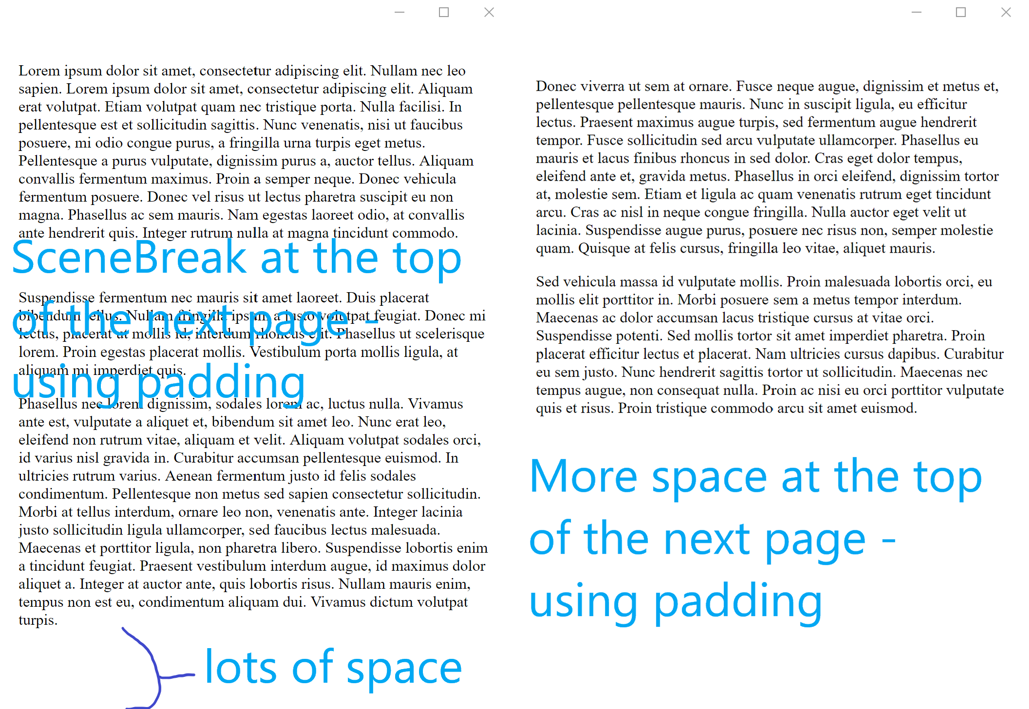 Using margin-top will reliably put spacing between paragraphs in the middle of a page, and if it just so happens that the widows/orphans pushes the next paragraph to the next page (leaving space at the end of the previous page) it will NOT put even more space at the top of the next page. This is much cleaner, IMO, and doesn't waste the valuable reading landscape. The other option, as others have mentioned, is to use an asterism of some kind all the time, either asterisks or a fleuron or something. You will still have the same issue of extra space being generated/wasted at the top of a page if you use padding... I think it is appropriate to be aware of the pluses and minuses of both tools, and use the proper tool for the scenario presented. You don't need to push one tool over another. Here are a couple of images to illustrate the point: |