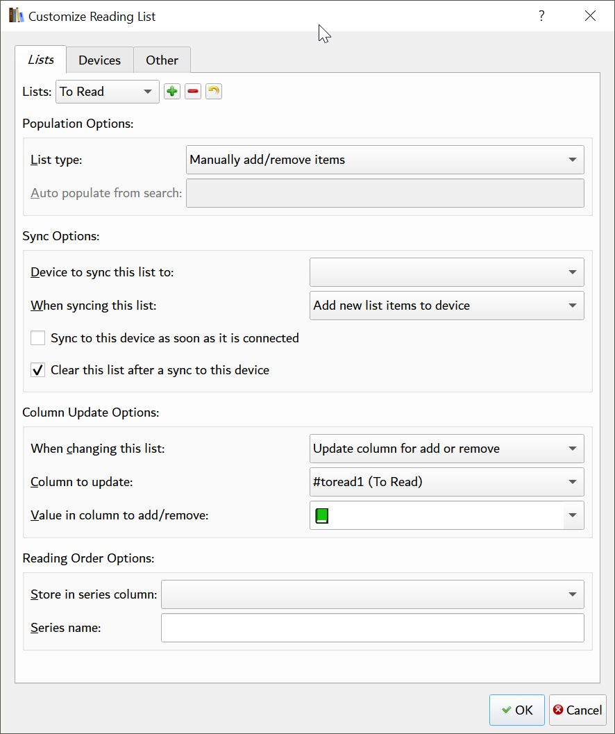 For the record, I use the "Add/overwrite all list items on the device" with the "Clear this list after a sync to the device". Then I have one list per device. Any new or changed books get added to the list for the device I want the book on. When the device is connected, the books are sent and the list is cleared. I don't keep a list of what is on the device. Because this method means the list would be "the books that are supposed to be on the device" plus what is in the reading list. And it doesn't harm if I add a book already on the device to the reading list. |
