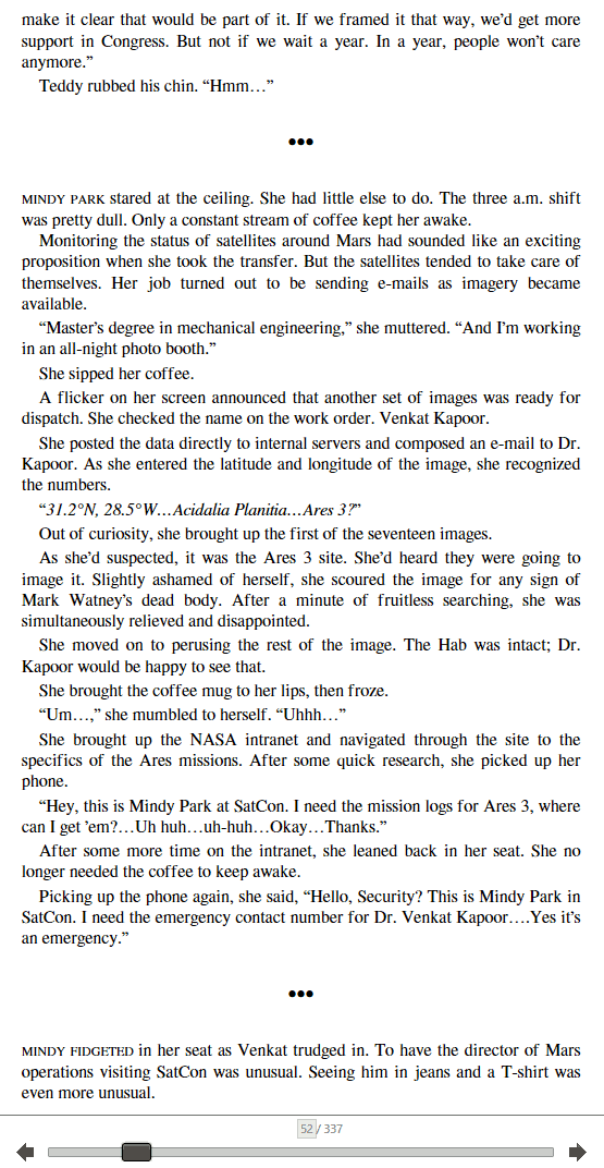 The simple gap+noindent also causes issues when the new scene starts at the very top of a page. You'll assume it's a continued/split paragraph from the previous screen. I think the one I read all those years ago was Andy Weir's The Martian. I just checked, and they mix Chapters > Daily Logs > gap+noindent / 3 centered bullets •••: Image 1 is the previous page. Image 2, you can see the gap+noindent landing on the very top of the screen. No reasonable person would notice this. You would continue reading, then wonder why there was just a drastic change in scene/tone, become confused, MAYBE click back... and/or just continue reading. Image 3 shows centered bullets in a later chapter. Overall, not the best ebook decisions, and probably just replicated the Print formatting... Nobody is reading the book at Image 1 and thinking: "Oh, that final word ends before hitting the right margin... the paragraph on next screen might start with no indent!" Side Note: Also, another potential reason against gap+noindent is users may read with (*shudders just thinking about it*) left aligned or "block paragraphs". Quote:
