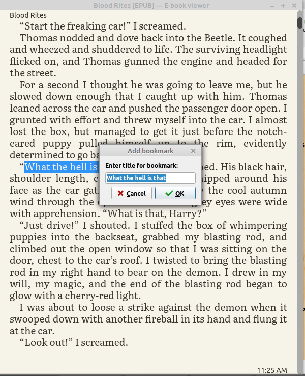 The bookmark panel is great when you want to carefully study a text. But when I'm focused on reading but come across something that I just want to mark on the fly for possible future review, displaying and switching to the bookmarks panel interrupts that focus unnecessarily. And the panel takes up too much room on the screen when the only reason you're keeping it open is just in case you want to drop a bookmark (even then you still have to click the panel before you can add a new bookmark). I do see that a shortcut was recently added for adding new bookmarks (see https://github.com/kovidgoyal/calibr...09365fdfd589aa). But Ctl+alt+b only works when the bookmarks panel has the focus, correct? So, I'd like to be able to hit a hotkey to drop a bookmark immediately, without opening the bookmarks panel. Please let me know what the magic keys are, if I've missed that command somehow. |