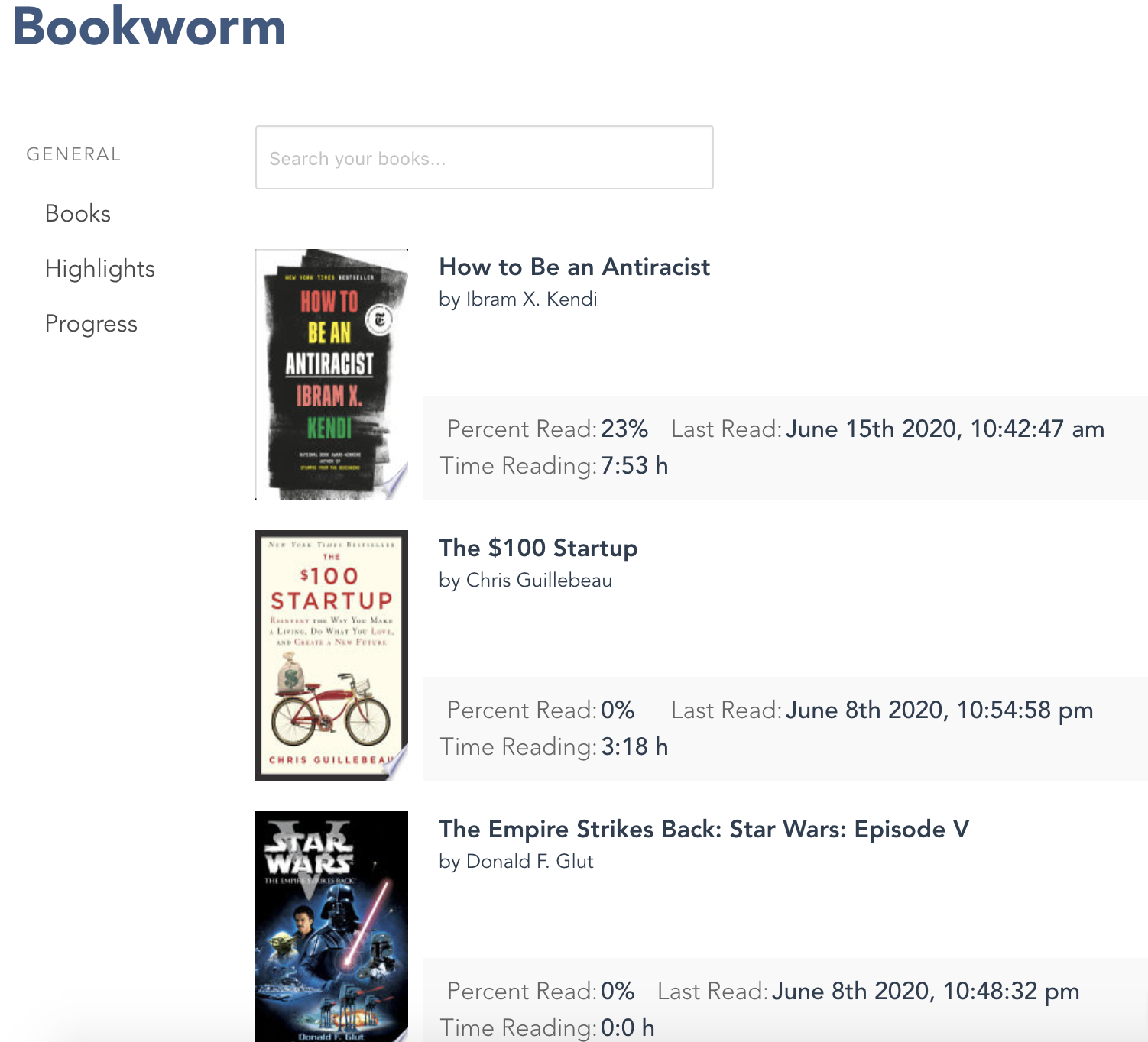I have been building this website for myself and I would like to see if there is any interest for a site like this. Basically I love my Kobo but I also think that it has some key features missing. Like: Highlights management; I highlight things in my kobo and I can't export them anywhere. I would like to have a place to search my highlights per book. Same applies for annotations; all the notes I write in my kobo should be available somewhere. The other main issue is the ability to better visualize my reading statistics with graphics. Page turns, amount of time read by day, month, year. Books read by month, year, and things like that. Would you like to use a site like this? Here is a preview of some of what I have done already (added pics as attachments). Cheers. Last edited by rigogsilva; 07-05-2020 at 03:02 PM. |