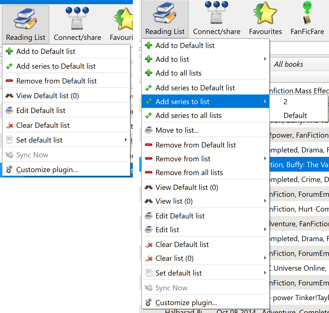 The ReadingList menu only has two states--when there's only one list and where there's more than one. I assume the more-than-one state is what you mean by 'plus options': You seem to be suggesting that you are sometimes seeing a third state between the two when there's 2 lists? If so, can you show me some screen captures of what it looks like and, ideally, a Calibre debug log from when it happens? Calibre->Preferences dropdown->Run in debug (The debug log also tells me about your OS & calibre versions, etc.) Minor point, but sure; that's easy. Already added in my code, so it's already hidden in the screen cap above. |
