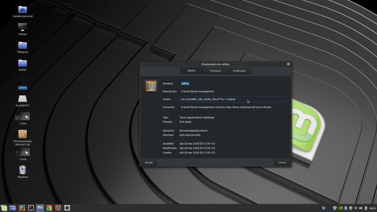 2-We create something as a shortcut and in that icon right click of the mouse preferences. 3-In the Order line we write: env CALIBRE_USE_DARK_PALETTE=1 caliber We double click on this icon and if we have a black theme in the system it will put us in dark mode Last edited by dunhill; 07-15-2020 at 11:23 PM. |