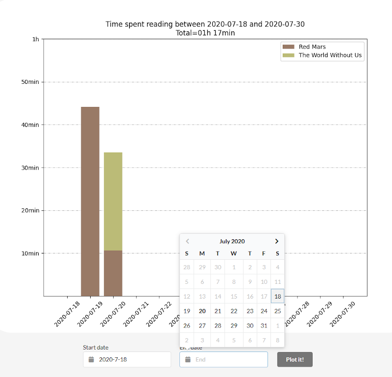 This is self hosted. The e-reader sends the result of a query to my PC, where it is parsed. (A shared site would not be something I would use because of the privacy issues that are inherent to that type of setup.) I can then lookup and search the results in a web page (though at the moment it is in need of a bit of styling...). After selecting the date range, a stacked bar chart is displayed, showing what and how much was read on a daily, weekly or monthly scale. Main drawbacks are that ideally the script which sends the query result to the PC should be run everyday the Kobo is used and secondly the results are only valid in scenarios where you use exclusively one device, since this data is not synced to the Kobo servers as davidfor warned on the previous post. Last edited by ndriver; 07-20-2020 at 08:57 PM. |