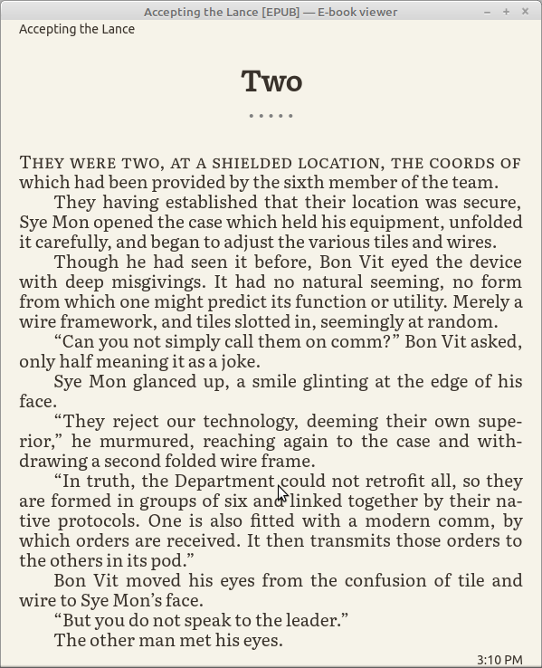 I'm reading the Kindle edition of Sharon Lee and Steve Miller's "Accepting the Lance" in Calibre. In Calibre 4.21 there is an issue with the first line of each chapter, wherein it extends several words beyond the right margin before the linebreak occurs.