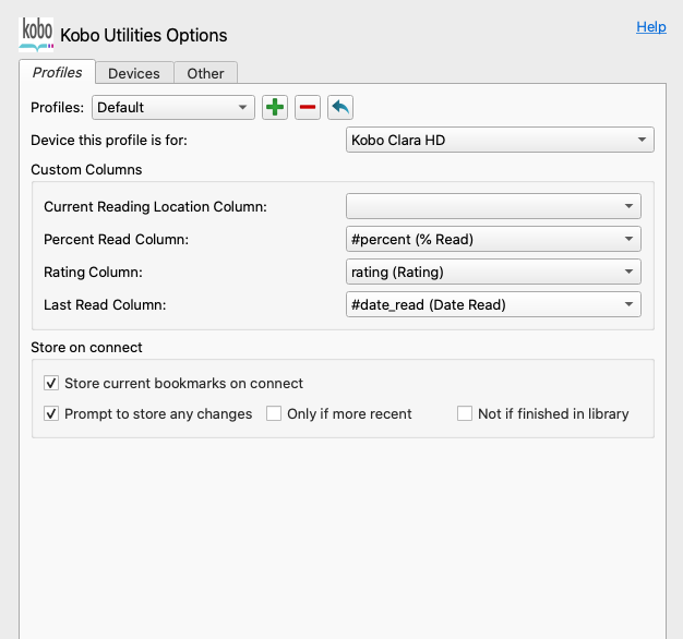 The most common reason for this is a factory reset. But, deleting the file "driveinfo.calibre" from the root directory of the device will also do it. The id for the matching comes from that file. If the file doesn't exist, calibre creates it. The id is randomly generated, so it will change. As I said in the post I linked, if you only have the one Kobo ereader, the simplest thing to do is to selected "*Any Device" in the configuration for the plugin. If you do have multiple devices, and want to have different configurations for them, you need to update the known devices in Devices tab. And then select it in the profile. I will have to revisit how this is done in the plugin. It probably should use the serial number, but, there are some issues with that. |