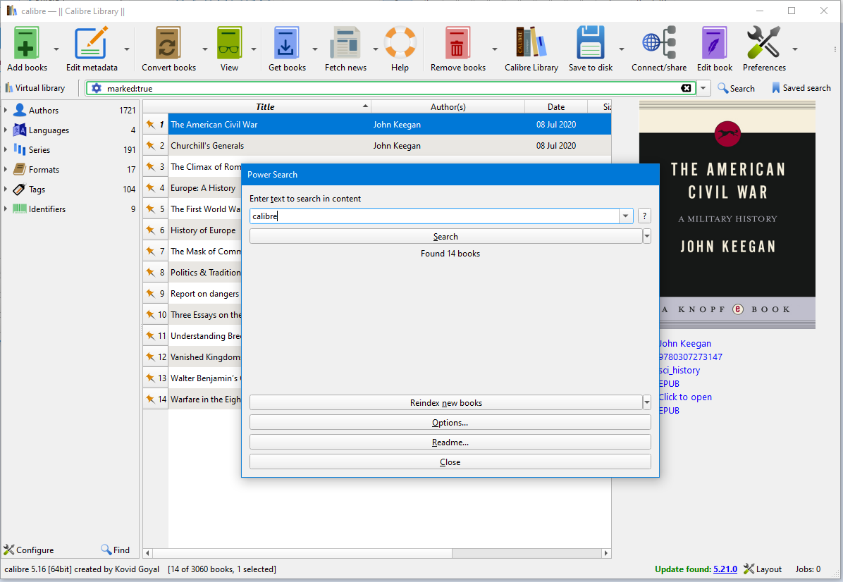 Calibre Power Search Plugin =========================== Version 2.2.0, released on 27 March 2022. Created by Michael Apozyan Platform: Linux, Windows, macOS Calibre versions: 3.x, 4.x, 5.x, 6.x Overview This plugin adds full-text search functionality to your electronic library. Default shortcut key for Power Search dialog is Ctrl+Shift+S. When you run Power Search, it will extract text from all your books on the fly and load all this text in a local full-text search engine. Plugin will never modify any books and records in Calibre library. As a search backend, we are using ElasticSearch. Once the search index is created and is up-to-date, Power Search will query search engine and display list of books where certain search keywords are found. For large libraries, running search for the first time might take a while. Subsequent searches will normally take less than a second. Usage We tried to make Power Search easy to use. And yet it allows you running complex queries too.