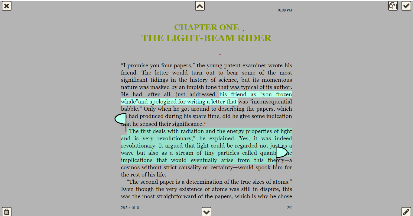 @democrite: I'm afraid I am not a fan of one click to create a highlight. Its too easy to accidentally do it. And after thinking about it, I suspect all these issues just come down to personal preferences, the best way to address them is to allow the user to customize the buttons in the popup bar. So there can be buttons for deleting highlights/for creating highlight with one tap, for opening the highlighter in selection adjust mode instead of notes/colors mode, etc. And if I create this preference setting, I can also create one to disable the popup bar completely for The_Ad and one to change where the search button does its search am surprised no one has asked for that yet
