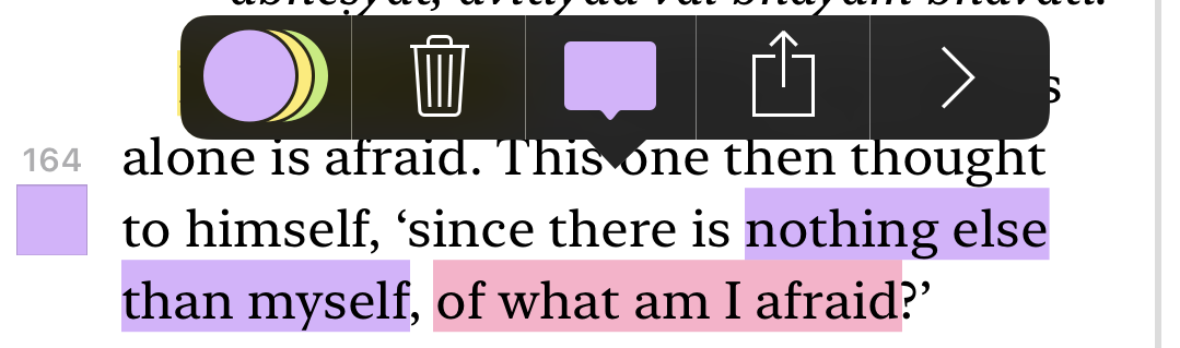 Attached are screenshots of Apple Books when one taps on an existing highlight, then with color selection. Colors are also darker in dark mode. There is also a note icon in the margin to easily see that there's a note. Concerning the colors, I think Apple Books has the best selection out of the apps I know. They are ordered by what one could call importance. The latter colors standout more as in the screenshots, easier to see if one uses various colors in the same paragraph, and wants certain passages marked as more important than others. A single tap on an existing highlight to show the popup bar to change colors, modify, or add a note I think is quicker, and consistent with all other apps. |