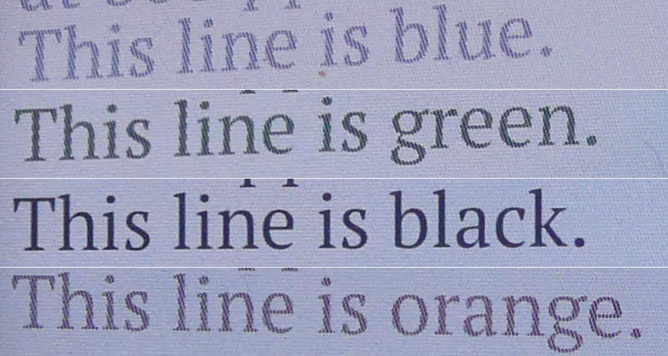 This is a 300→100 DPI degradation on a similarly sized font: This is what going from 300 to 100 means. (The other example used smaller fonts, to show the difference better, as I wanted to scale the pixels 2x in the better-looking string to show them pixels). EDIT: and in fact, I think that a zoom-in comparison is more telling: Now, in Kaleido there is even no need to downgrade to 100DPI, because really that should involve one direction only. And if it did, it would be disastrous, because - well, that example above is what is meant by it. But several commentators, and Kozlowski was the first one from whom I read it, said so. Kozlowski wrote «PDF rendering engines will display PDF files as an image [at 100 PPI], because that is basically what they are» (and I report this because it has the potential to be very misleading... Note that according to such statement, even black text on white would massively, 9x downgrade! Hence my post #21 at https://www.mobileread.com/forums/sh...5&postcount=21). To the best of current reconstructions, that is not happening. That should not happen, for many technical reasons, and that must not happen, because it would mean the devastation above. Your traditional display may use ~96DPI, but you are keeping it at arm length, not at book distance. This is why the matter is not secondary. Last edited by mdp; 08-02-2020 at 03:01 PM. |