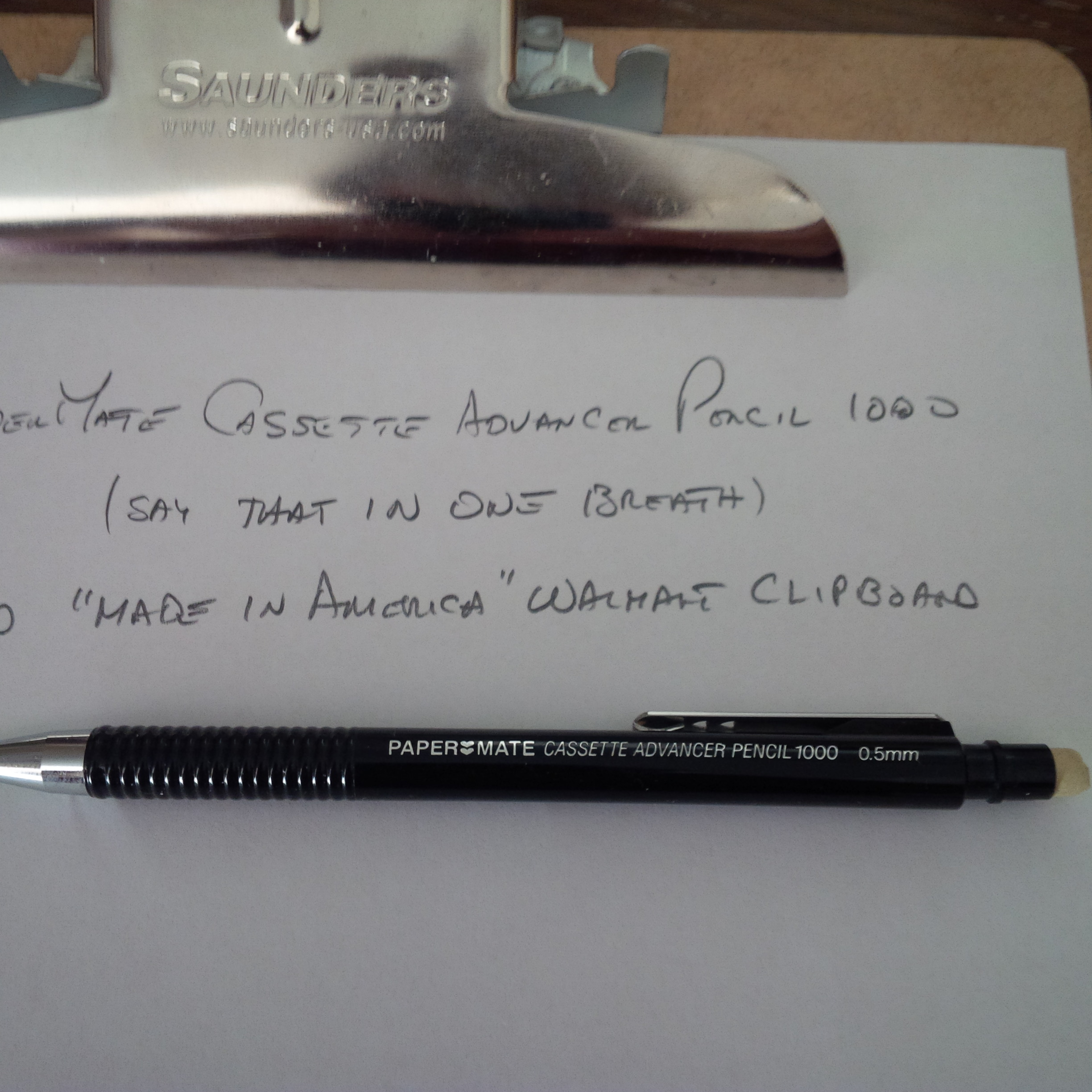 I like the weight and feel of the PaperMate Advancer. For a while there were a lot of cassette mechanical pencils. Scripto, Berol, Sanford, PaperMate, Schaeffer – and probably several others – sold them. I guess the idea was that you never had to touch the lead. These were all either manufactured by (or licensed to) Kotobuki, a Japanese pen and pencil company that holds more mechanical pencil patents than any other company in the world. https://data.epo.org/publication-ser.../document.html You can still find these Advancers. A stationary company has been selling them for years on eBay and Amazon. https://www.amazon.com/Papermate-Cas...7364593&sr=8-1 Finding the original cartridges is about impossible, but you can refill them. What I did, though, is bought these cartridges (you won't be able to use the cap). 600 leads for about $8.50 and it's good, high quality, smooth lead. The erasers are dried up though, so you'll have to find another source for them. https://www.ebay.com/itm/Paper-Mate-...b341%7Ciid%3A1 The clipboard... https://www.walmart.com/ip/Saunders-...Clip/130584306 As usual, I ramble way too long on these things. Sorry. |