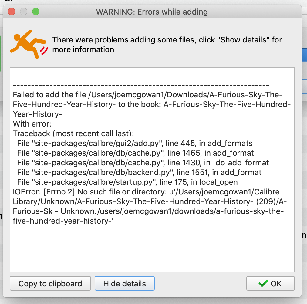 Here is the error I get when trying to add to Calibre. Note my iMac defaults to book extensions to filter down to e-books. I have to choose all files to make the download available to select. I have attached an image of the error.