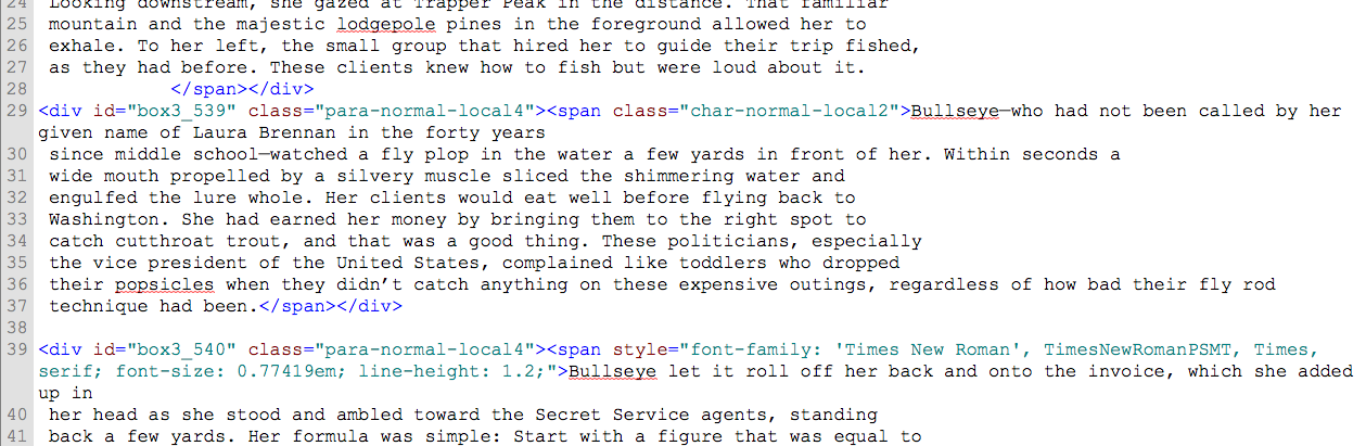 Having all those inline styling, and classes saying "this is a normal paragraph" (instead of just using a normal paragraph tag) really bloats up your code and makes it much more complex than it needs to be. It is much easier to have your styling in a centralized location (like a style sheet) where you can make changes to a single location and have it apply to your entire book...instead of having to update every paragraph every time. There are definitely good arguments saying you shouldn't define the font, font-size, line-height, paragraph indents, etc. and you should leave that up to the users/readers to select in their own app/device...but that is your choice. A couple good regex search and replace can fix your entire book very quickly. |