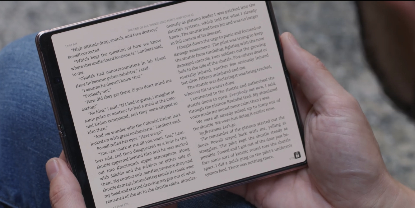 Kindle on the Fold (from The Verge video review @6:27): The Duo is the lightest and thinnest tablet on market and has highest DPI* as well. I was hyped for the Samsung Fold last year but they didn’t get the experience right; just look at that photo — you have to hold it in landscape to get the tablet experience (i.e. with the crease running horizontally instead of naturally along a book’s spine). I expect the reviews coming after the embargo is lifted today will say the Duo is not worth the price for a phone, that the camera is poor etc but as a Kindle/Graphic novel reader it looks amazing too me **excluding the Huawei folding phone which doesn’t have Google Play/ Kindle anyway) Last edited by pdurrant; 09-10-2020 at 08:45 AM. Reason: oversize images |