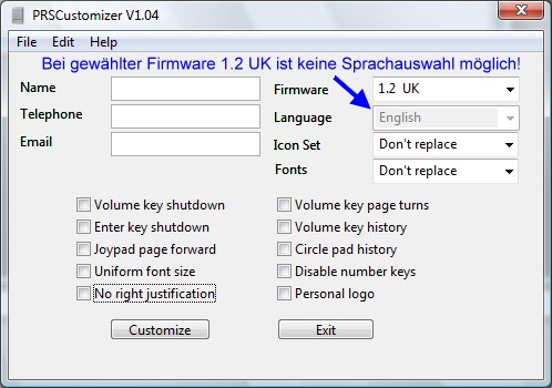 Nur eine kleine Verbesserung, tut mir leid für die automatische Übersetzung: PRSCustomizer 1.04 unterstützt auch die englische Firmware(UK) 1.2, daher ist es nicht nötig, auf die amerikanische Firmware 1.1 downzugraden, um flashen zu können, wenn Sie einen Reader mit dieser Firmware haben.